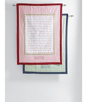 In northern China, the birth of a child is celebrated with a colorful Bai Jia Bei, or "100 Good Wishes Quilt." Originally, the tradition involved cloth contributed by the newborn's friends and family. The quilt is said to contain the energy, good fortune and loving wishes of the gift givers. Inspired by this tradition, we've silk-screened 100 well-wishing messages on a beautiful pastel quilt designed to surround baby with love. Exclusively from RedEnvelope.